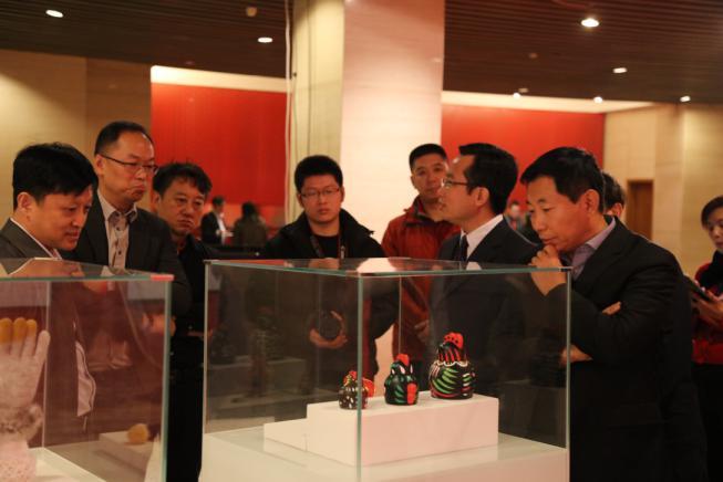 嘉宾正在观看产品设计单元优秀设计奖:中国民间泥塑套装系列“四鸡吉祥”。