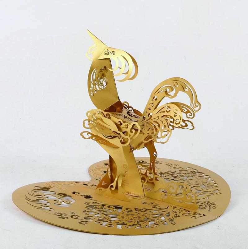 获得平面设计类组委会特别奖的作品名为“Super 吉”,作品以爱的手势表达鸡的形态以及新年时节的精气神。剪纸作品“高歌”则获得了产品设计类的大奖,设计师巧妙利用立体剪纸手法,使作品展开后成为一只挺拔的金色雄鸡跃起,寓意鸡鸣喜报,欢啼盛世。